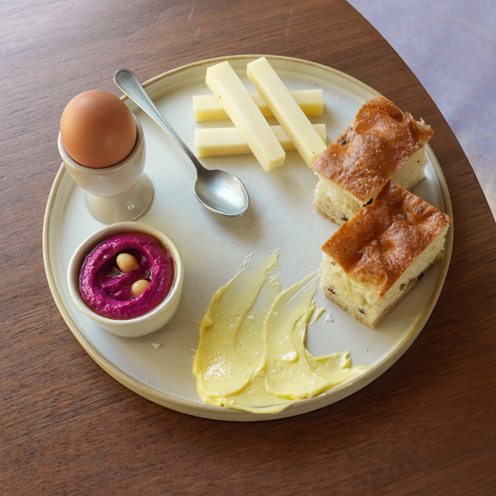 Morning Platter | Soft-Boiled Egg, Fontina Cheese, Focaccia, Beetroot Hummus | E, G, D | 50 AED