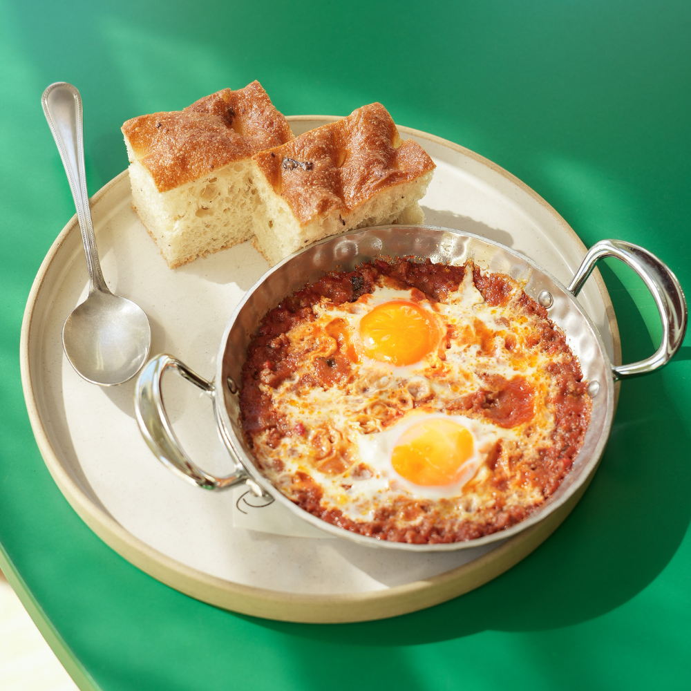 Eggs in Purgatory | Italian Beef Sausage, Spicy Tomato Sauce, Baked Eggs, Focaccia | E, G, D |