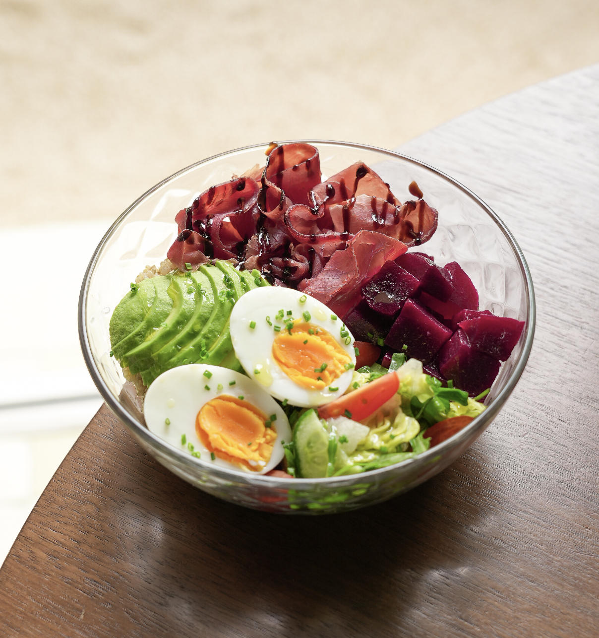 Oppidan Bowl | Beef Bresaola, Hard-Boiled Eggs, Quinoa, Avocado, Beetroot, Lettuce, Balsamic Dressing | M, E | 60 AED